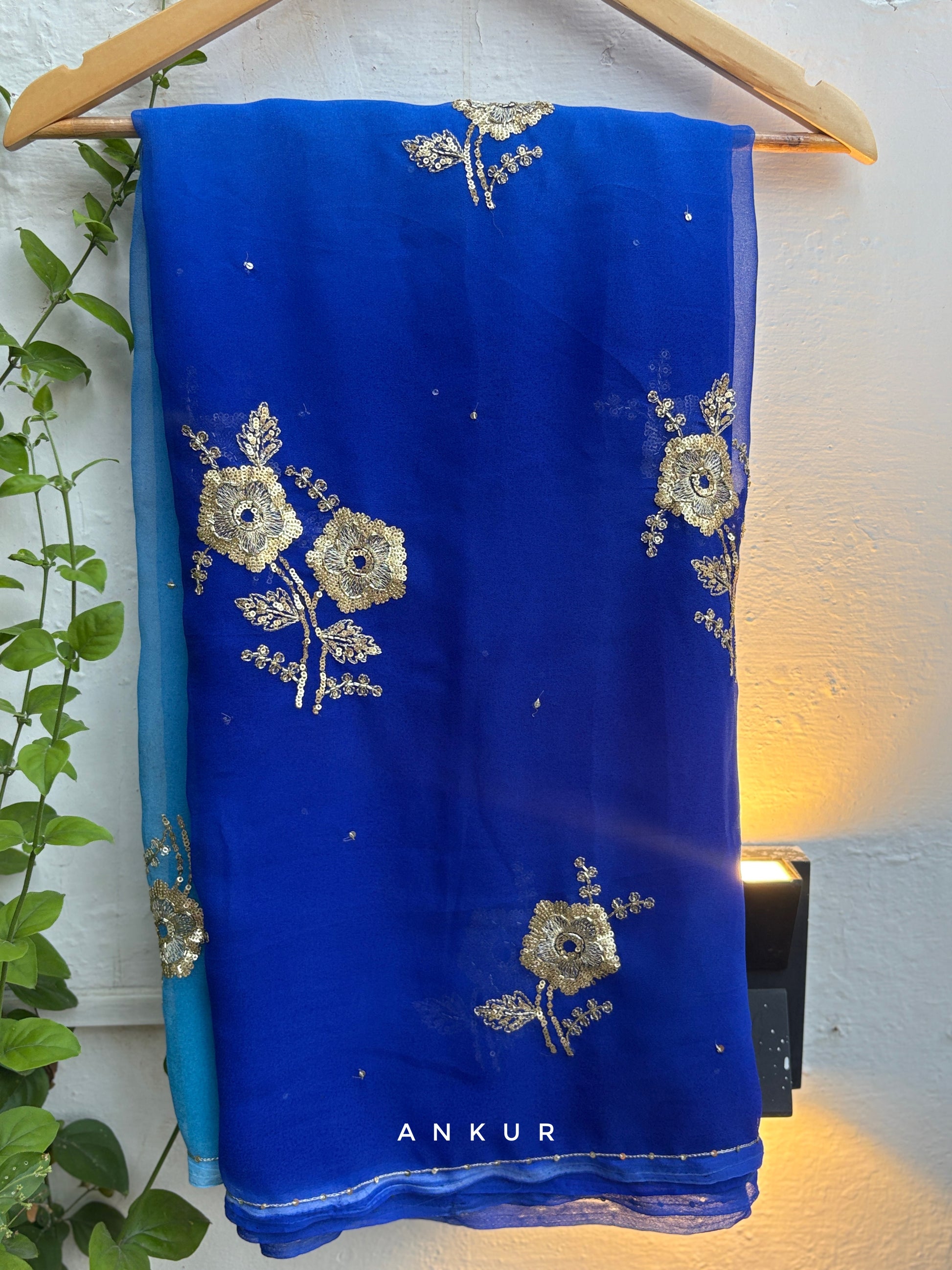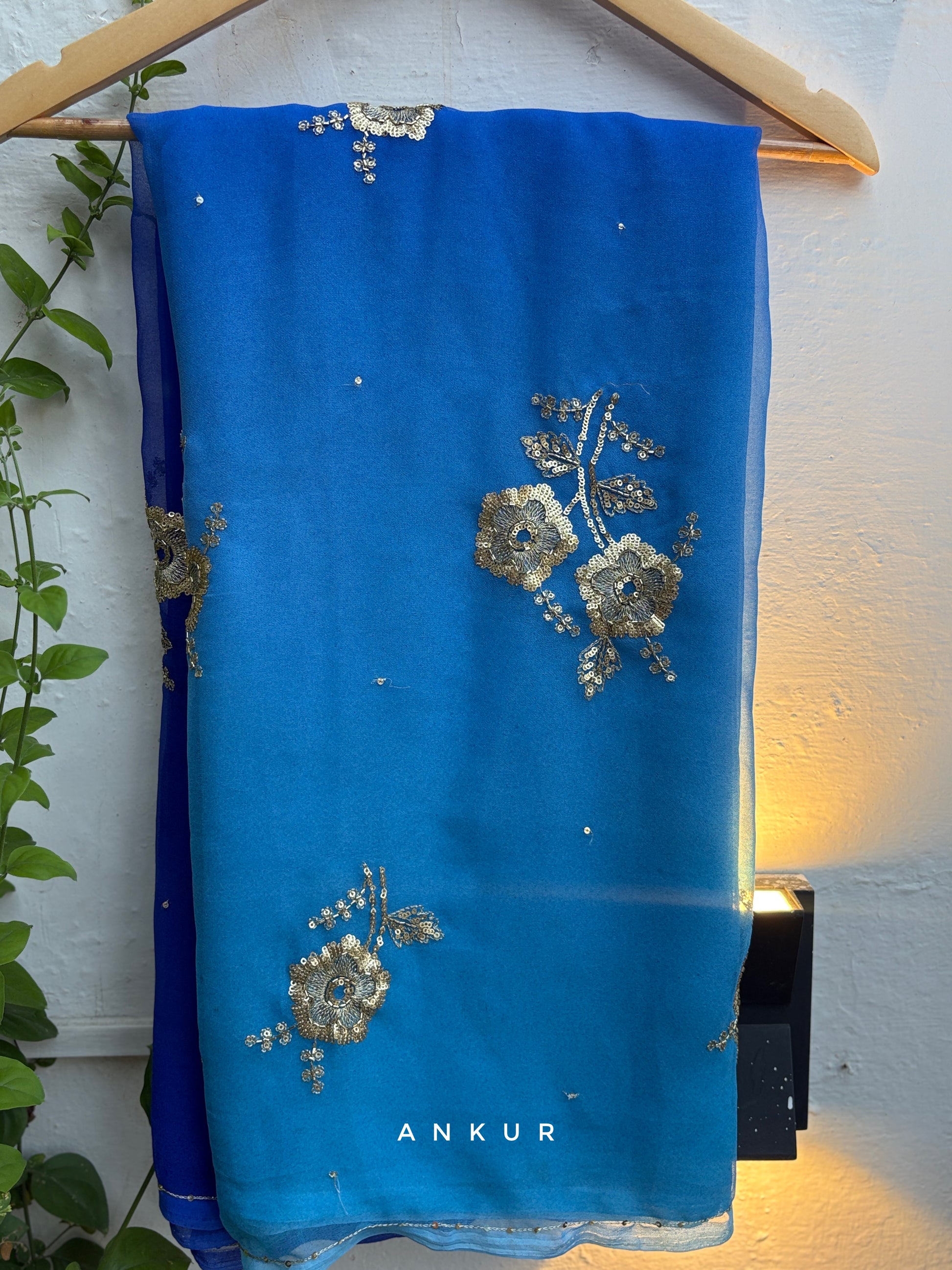 WeightLess Chiffon based saree with beautiful Zari sequins work all over the saree, blended with beautiful chain work on border done by hand by karigarhs .