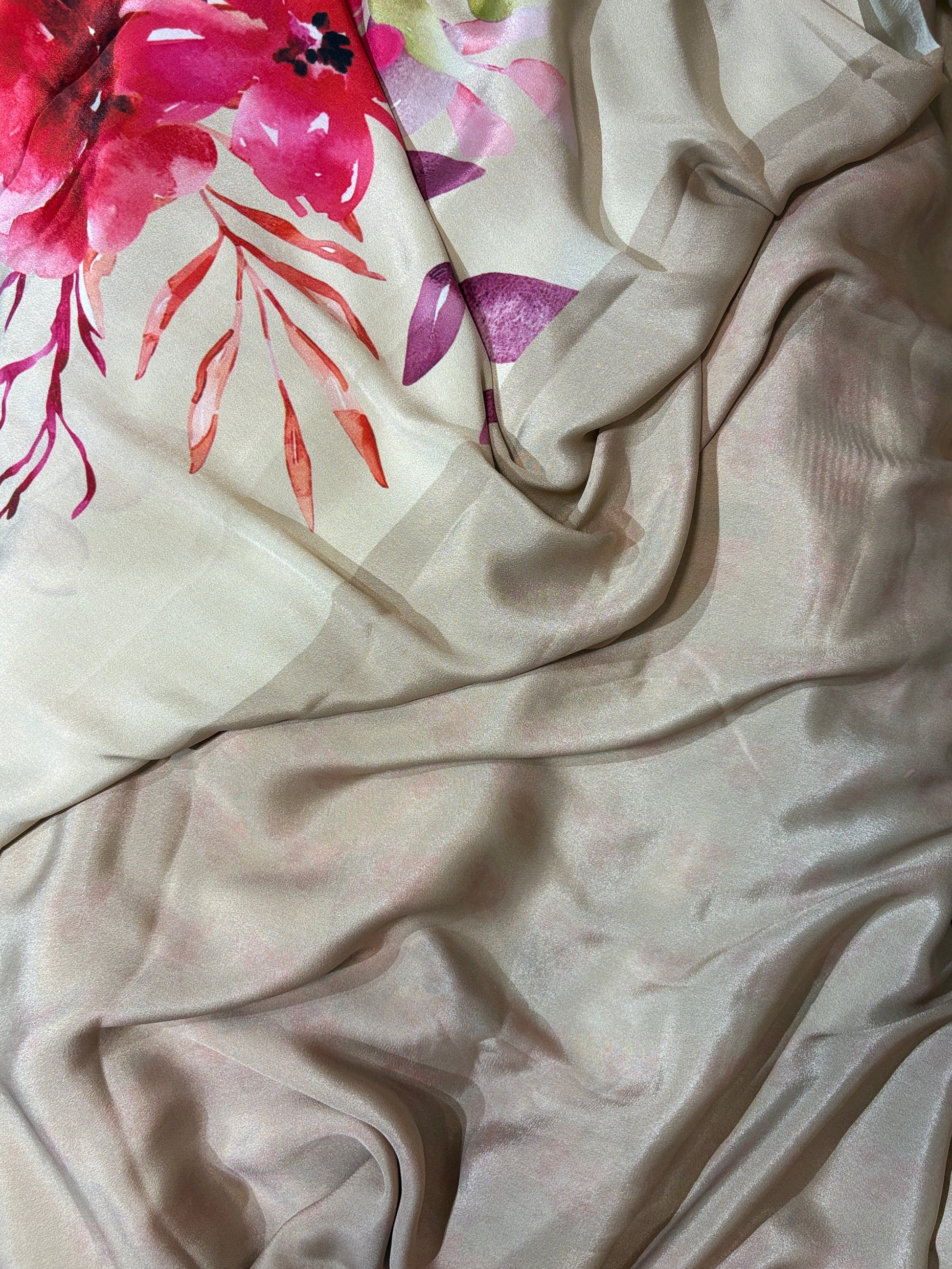 This Premium Italian Silk saree comes in a 5.5-meter length with a matching blouse piece included. It features vibrant and rich colours that instantly catch the eye. The fabric feels soft, smooth, and luxurious, giving you an effortlessly elegant and premium look. Designed for convenience, it is easy to wash and low-maintenance, making it perfect for regular use. The saree showcases a beautiful floral digital print with sharp detailing, while its lightweight material ensures all-day comfort. With its graceful fall and drape that enhances the body shape and its colourfast durability that maintains long-lasting shine, this saree is ideal for family functions, festive gatherings, weddings, and party events.