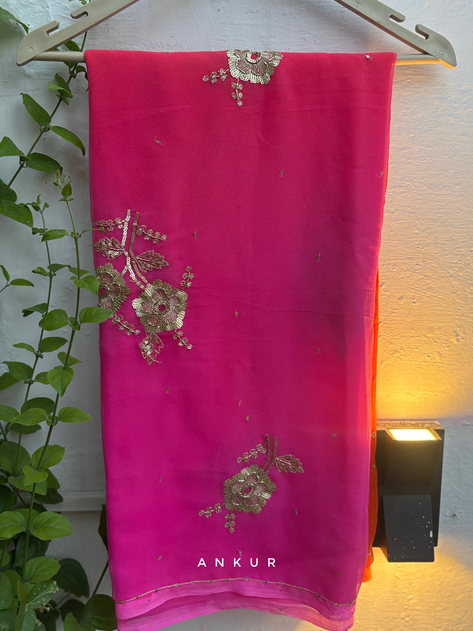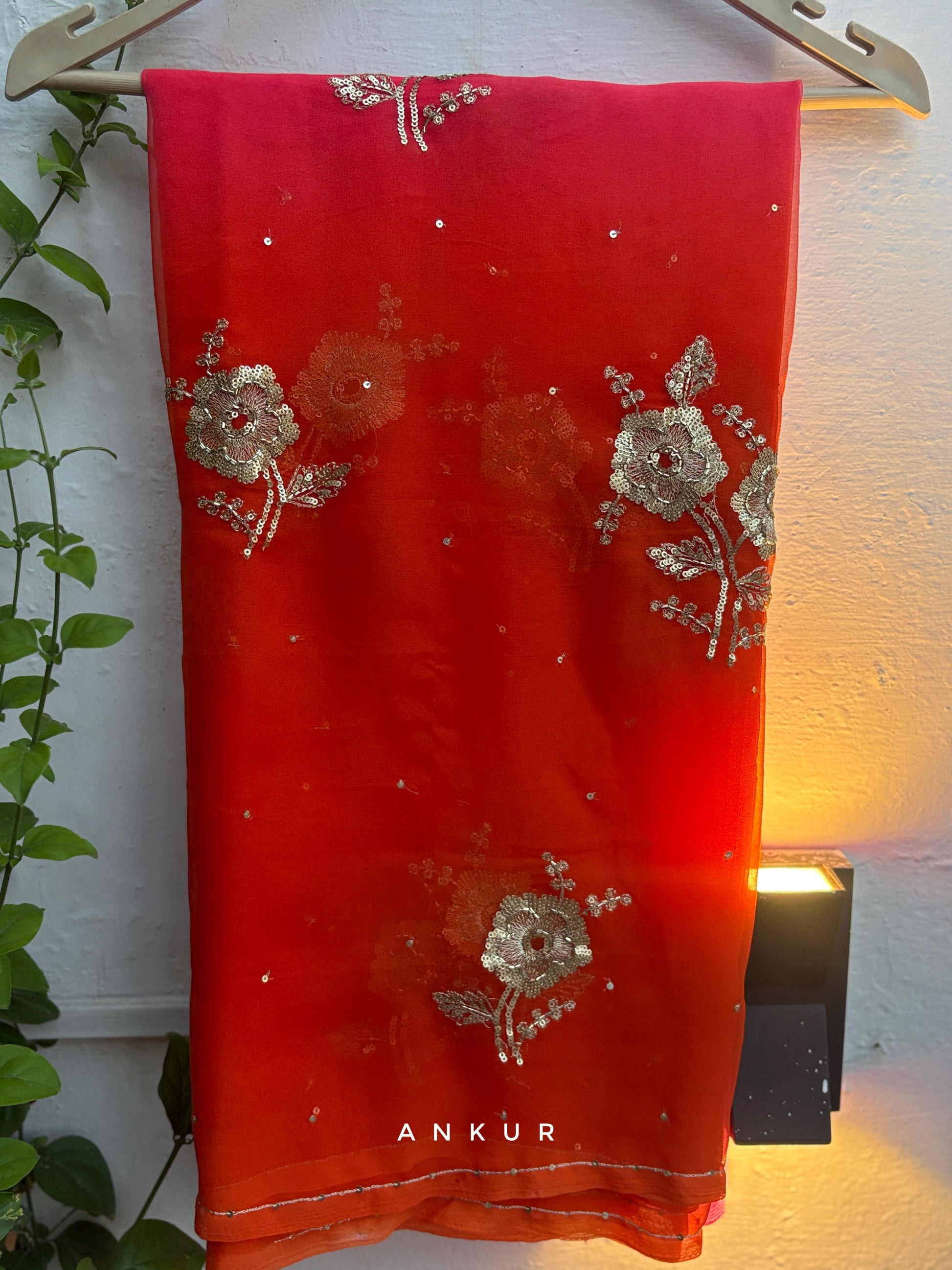WeightLess Chiffon based saree with beautiful Zari sequins work all over the saree, blended with beautiful chain work on border done by hand by karigarhs .