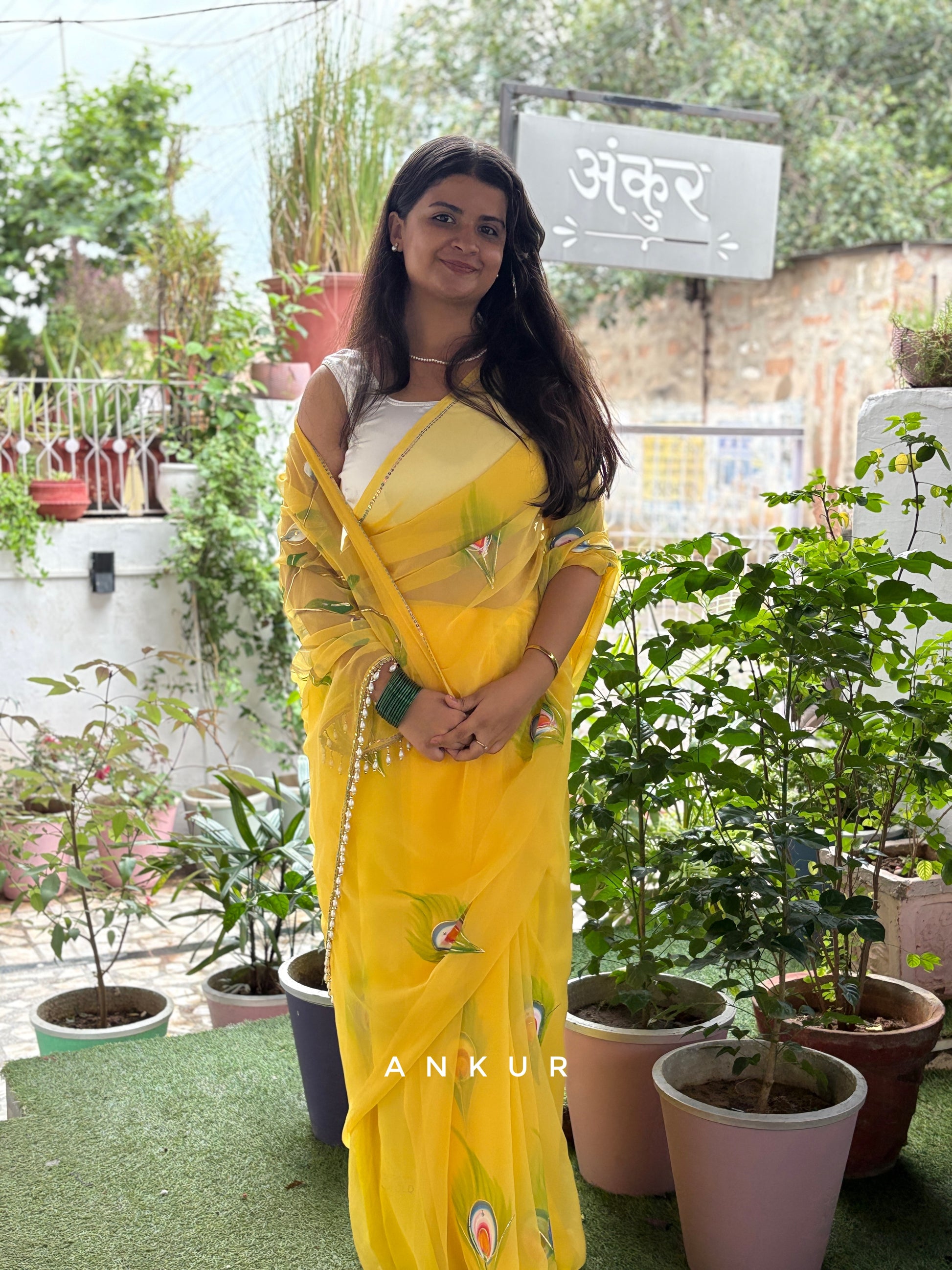 Note: These sarees don't have blouse with them as customers prefer wearing contrast or matching blouse with they like or you can choose cotton blouse fabric from option for 150/- (colour of that will be decided by ankurs team )