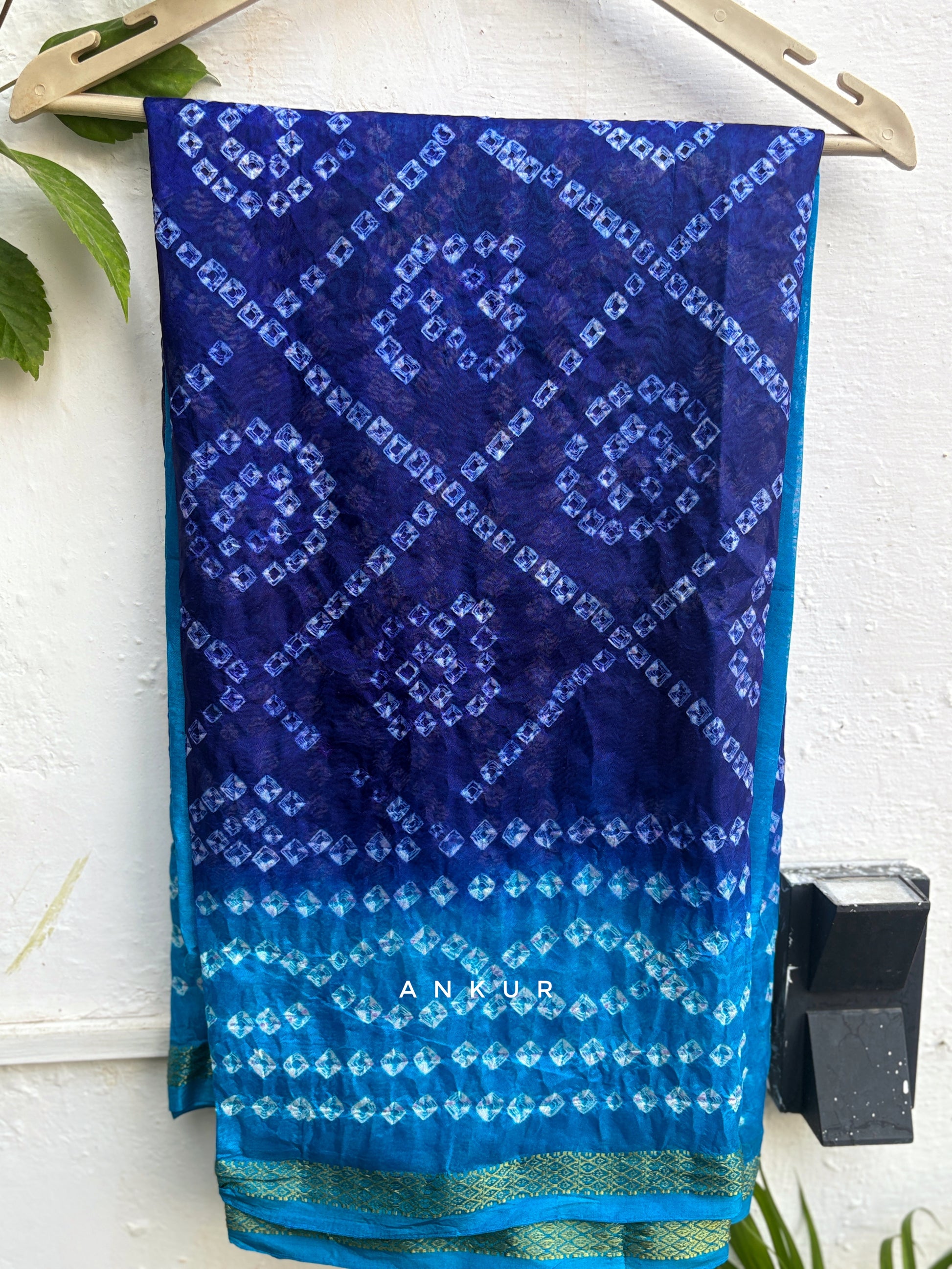 Authentic Bandhani (bandhej) pattern featuring classic white dotted motifs created through hand- tided dyeing.