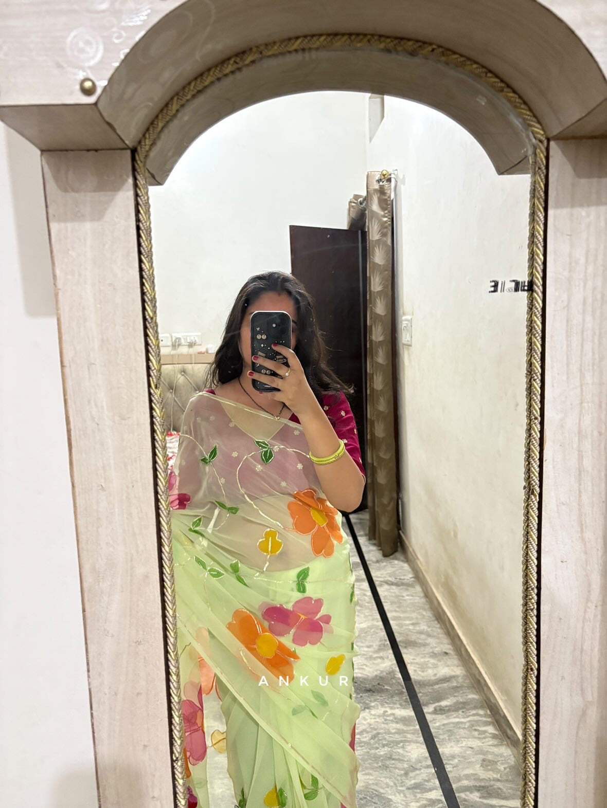 Georgette based saree with beautiful hand paint and gotta work all over the saree.