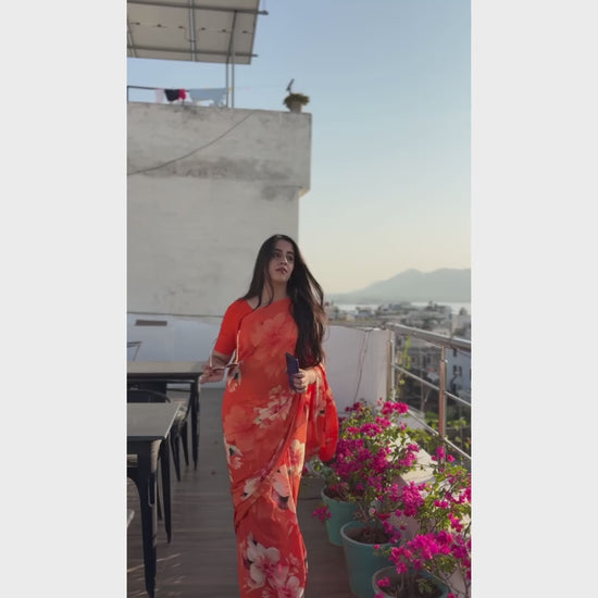 This Premium Italian Silk saree comes in a 5.5-meter length with a matching blouse piece included. It features vibrant and rich colours that instantly catch the eye. The fabric feels soft, smooth, and luxurious, giving you an effortlessly elegant and premium look. Designed for convenience, it is easy to wash and low-maintenance, making it perfect for regular use. The saree showcases a beautiful floral digital print with sharp detailing, while its lightweight material ensures all-day comfort. With its graceful fall and drape that enhances the body shape and its colourfast durability that maintains long-lasting shine, this saree is ideal for family functions, festive gatherings, weddings, and party events.